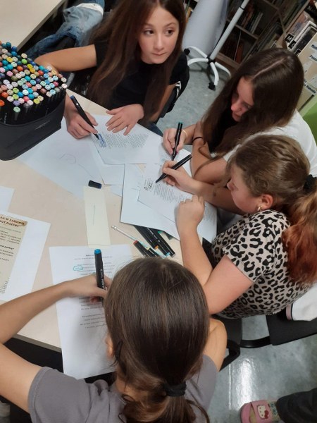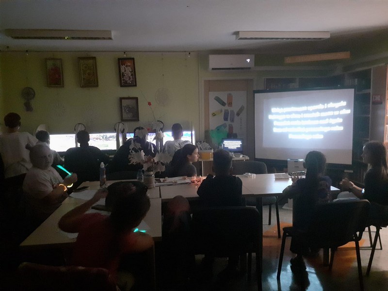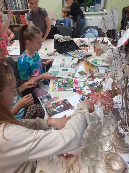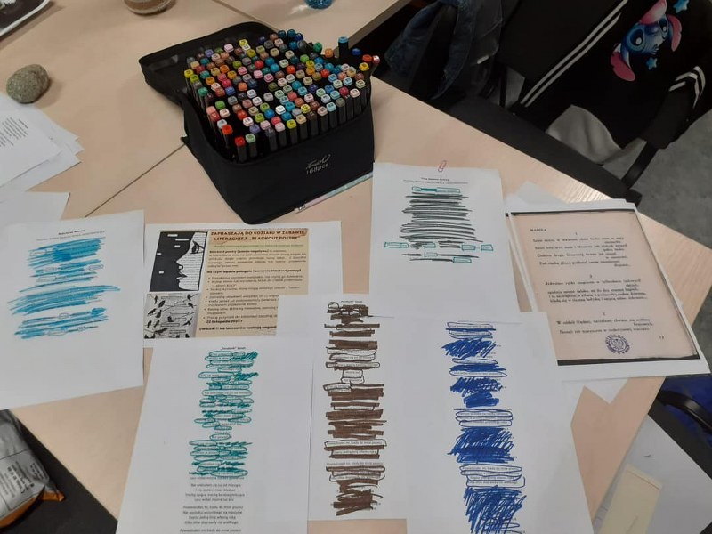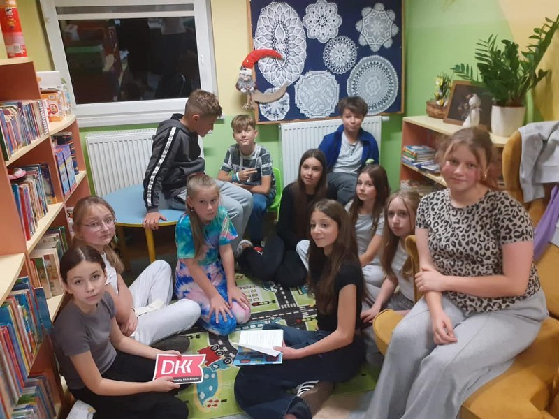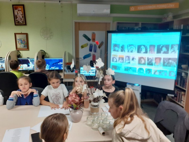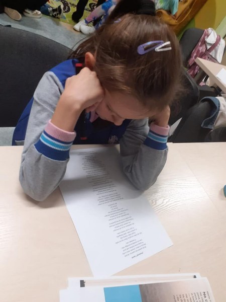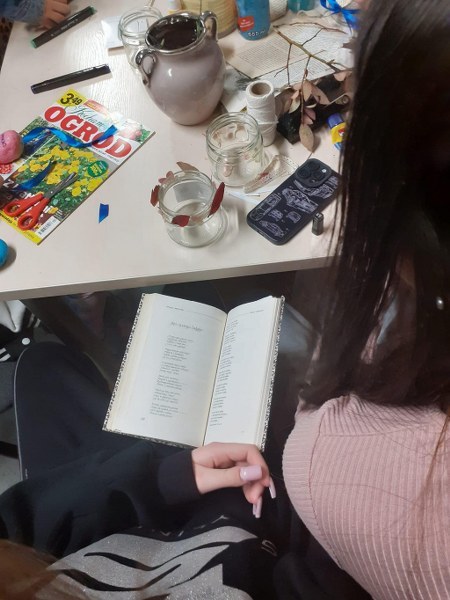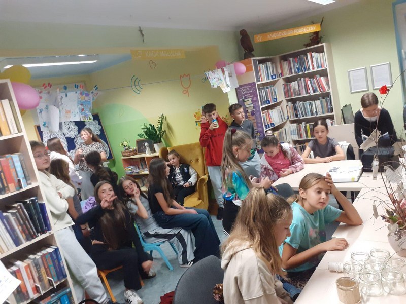 Wierni hasłu ruszyliśmy do działania: metodą podchodów szulaliśmy skarbu ukrytego w bibliotece, dekorowaliśmy słoiki, zapoznaliśmy się z twórczością patronki roku – Marii Pawlikowskiej – Jasnorzewskiej, czytaliśmy wiersze, wykonywaliśmy prace metodą kolażu, uczestniczyliśmy w zabawie literackiej „Blackout Poetry”, wypisywaliśmy słowa klucze z twórczości poetki na ozdobnych kamieniach. Nie brakło również ruchu: tańców i ćwiczeń wokalnych, poezji śpiewanej – wraz z Sanah śpiewaliśmy „Pocałunki”. Oczywiście kąciki zabaw były również aktywne: X-box, piłkarzyki, komputery, stoliki karciane… Swoje spotkanie miał również po raz pierwszy w tym roku szkolnym Dyskusyjny Klub Książki – omawialiśmy „Walizka pełna marzeń” L. Bardijewskiej.