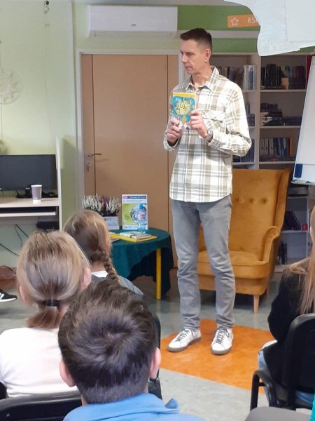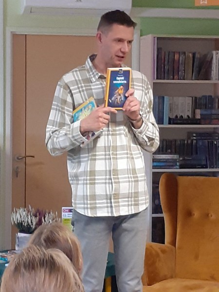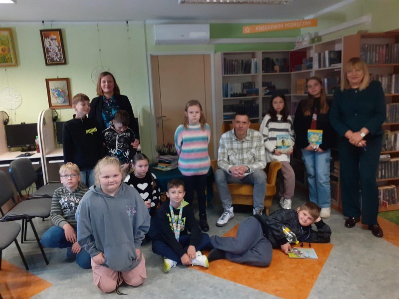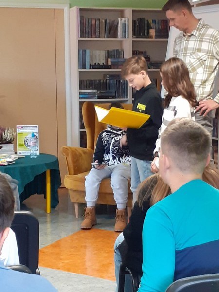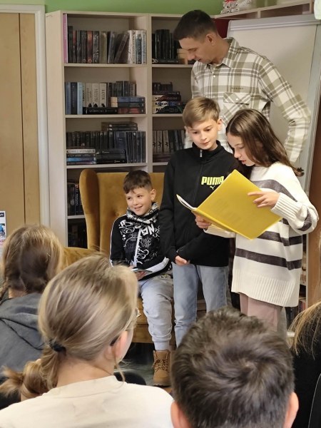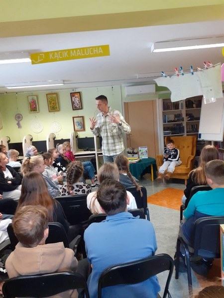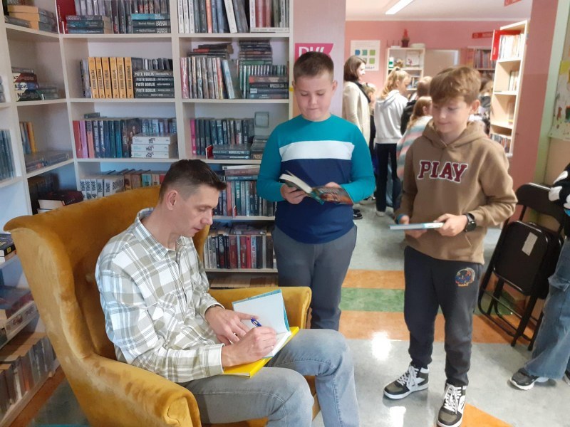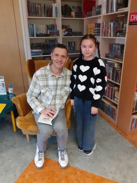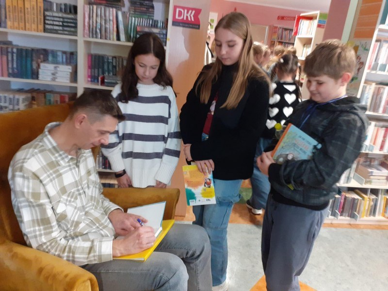 Spotkanie przebiegało w radosnej atmosferze przy wielkim zaangażowaniu uczniów, którzy bęzbłędnie rozwiązywali zagadki, układali rymy do wiersza, czytali na czas i wypowiadali się na temat swojego talentu. Chętnie i z zainteresowaniem wysłuchaliśmy również czytania fr. utworów przez samego autora. A na jesienne długie wieczory zaopatrzyliśmy się w nowe lektury z autografem pisarza.